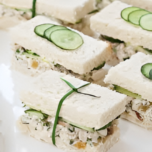 in choices of smoked salmon with cucumbers or dilled cream cheese, turkey with cranberry sauce or chicken salad and mixed greens, watercress & goat cheese. (2pcs)